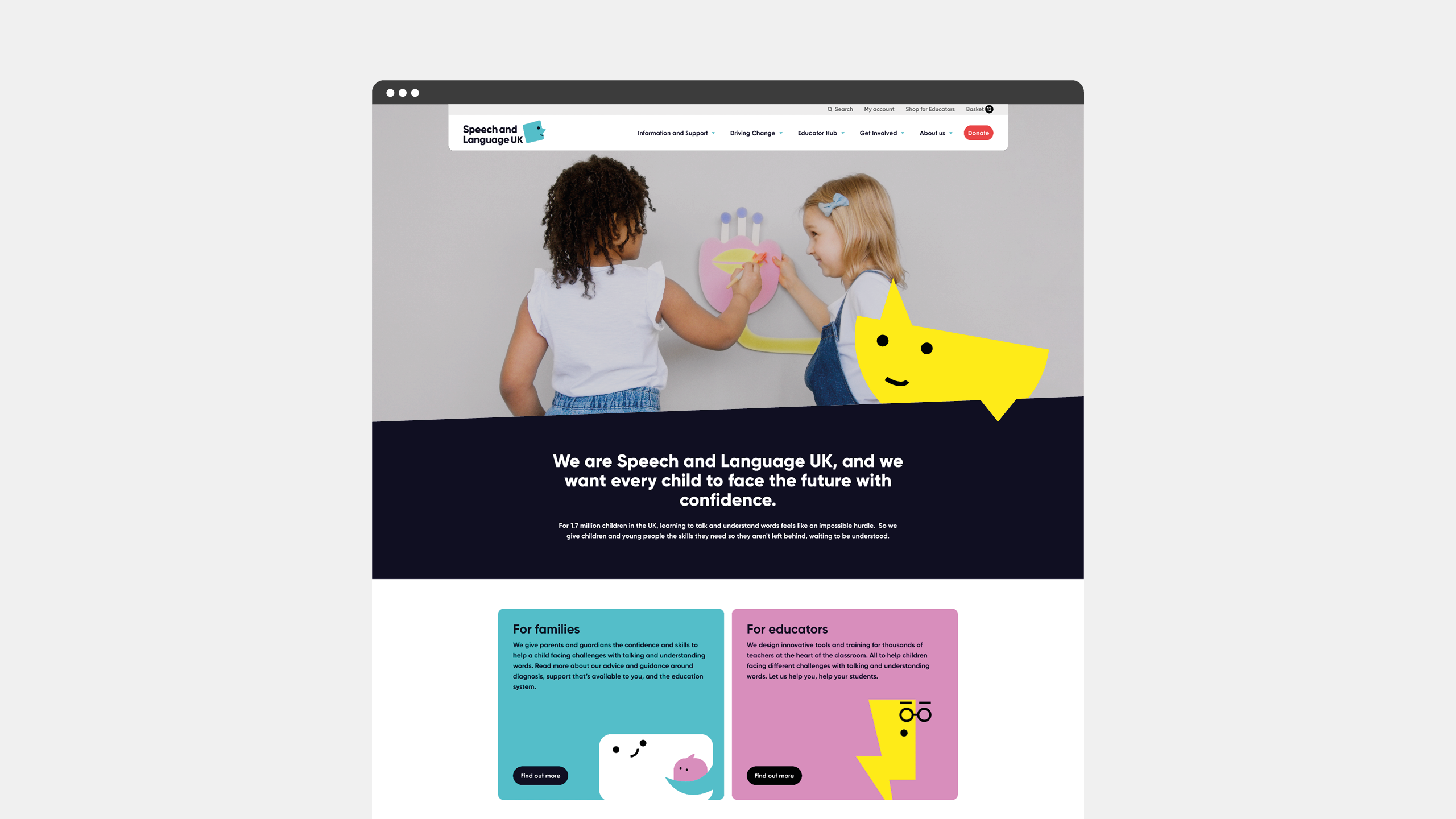 Studio Texture was approached by Speech and Language UK (formerly I CAN) to shape a new name, brand strategy and identity, and refreshed website. This was part of the charity’s wider ambition to reach more of the 1.7 million children* who have challenges with talking and understanding words. Particularly in the aftermath of the COVID pandemic lockdown.