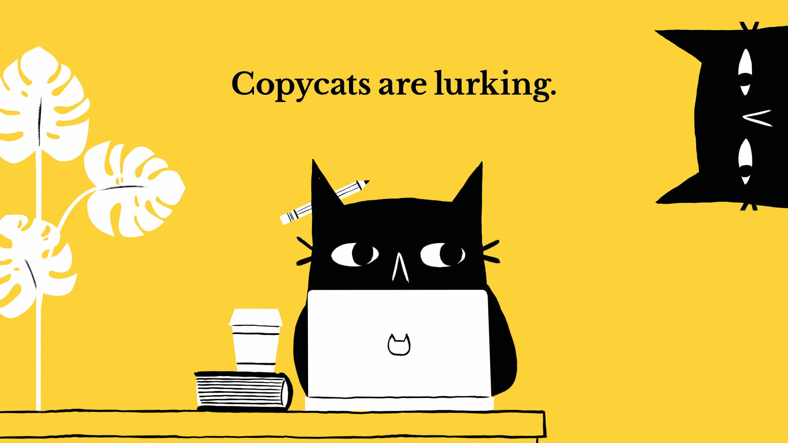 Our core idea: ‘Copycats are lurking’, balanced the seriousness of the threat, with a light-hearted, bold illustration and animation style. The challenge was in bringing out a range of emotions within the cats using the eyes as a means to convey expression. From fear, to sneakiness, to shock, to concern, the ‘copycat’ character reflects the emotions the audience will likely feel. Underplayed humour and language played a critical role in setting up the various scenarios.