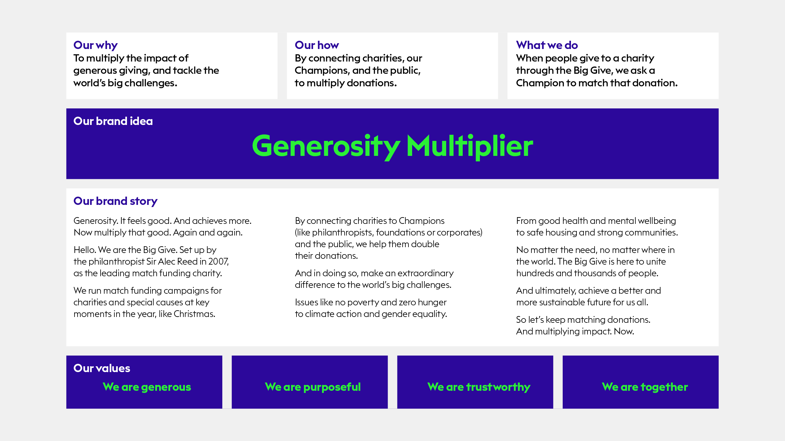 Working with brand consultant Dan Dufour we rebranded match funding charity the Big Give with a new brand strategy, visual identity and tone of voice.